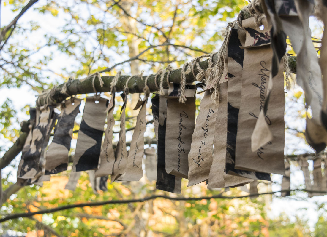 “Prayergrams” are tied to trees outside the L-Space Gallery at Humber College Lakeshore. This installation by Susan Mentis was assisted by members of three calligraphy guilds in the community, and is dedicated to the 1,511 patients of the former Lakeshore Psychiatric Hospital who are mostly buried in unmarked graves.