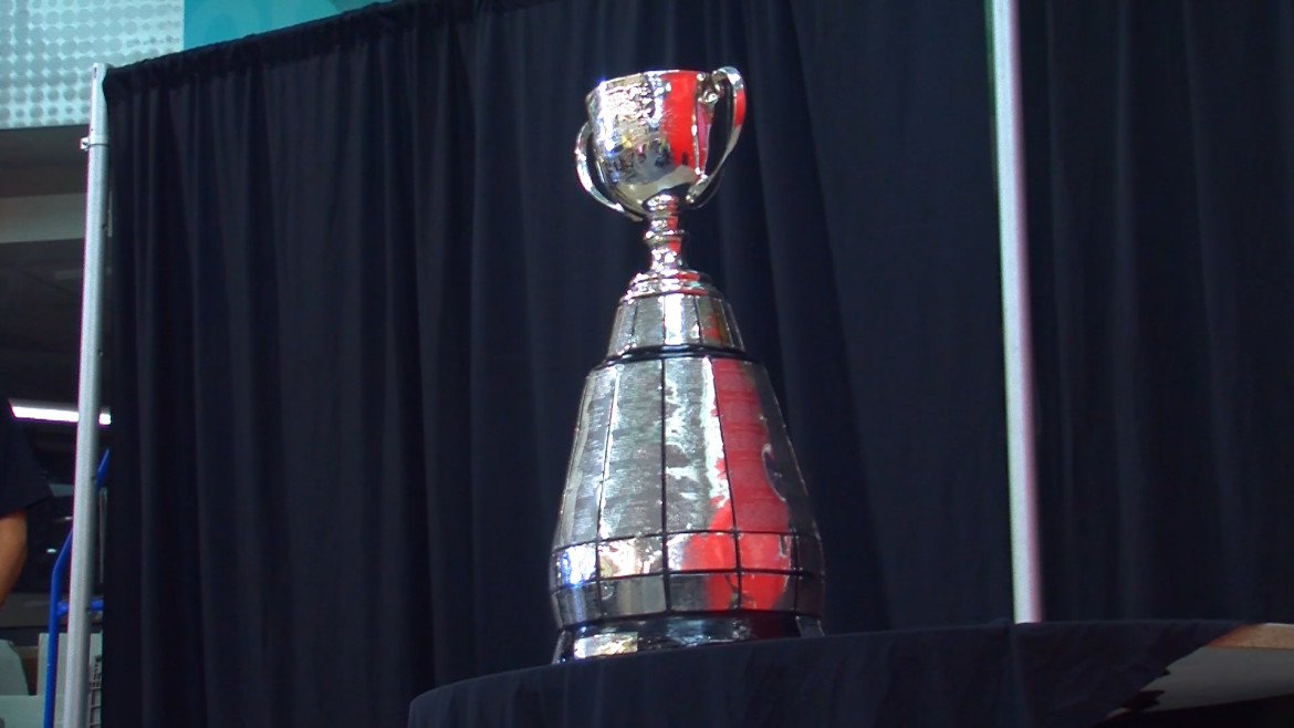 The Grey Cup was on display for people to pose with in advance of the 104th Grey Cup game on Nov. 27 in Toronto. The Edmonton Eskimos and Hamilton Tiger-Cats will play for the Canadian Football League championship at BMO field.