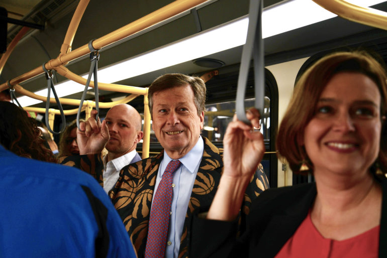 Mayor John Tory riding the electric bus with a group of the first eBus passengers on the 35 Jane Route on Monday. (Asmita Munde)