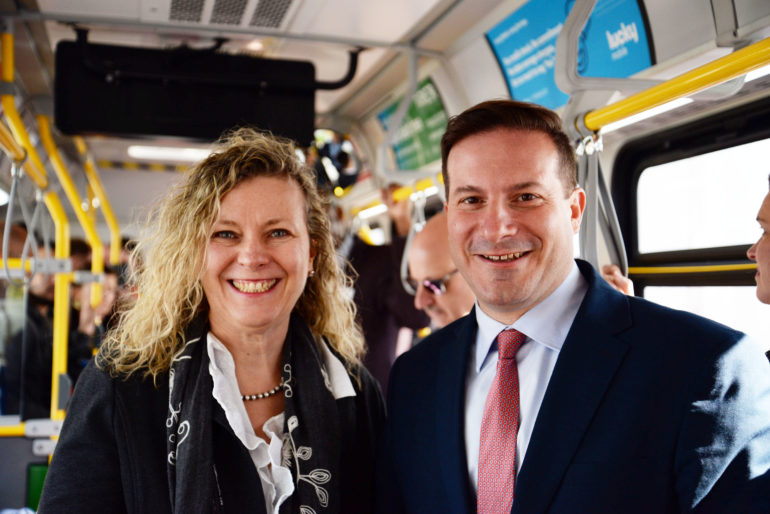 TTC chair, Jaye Robinson (left) and MP Marco Mendicino riding the eBus that was unveiled on Monday. (Asmita Munde)