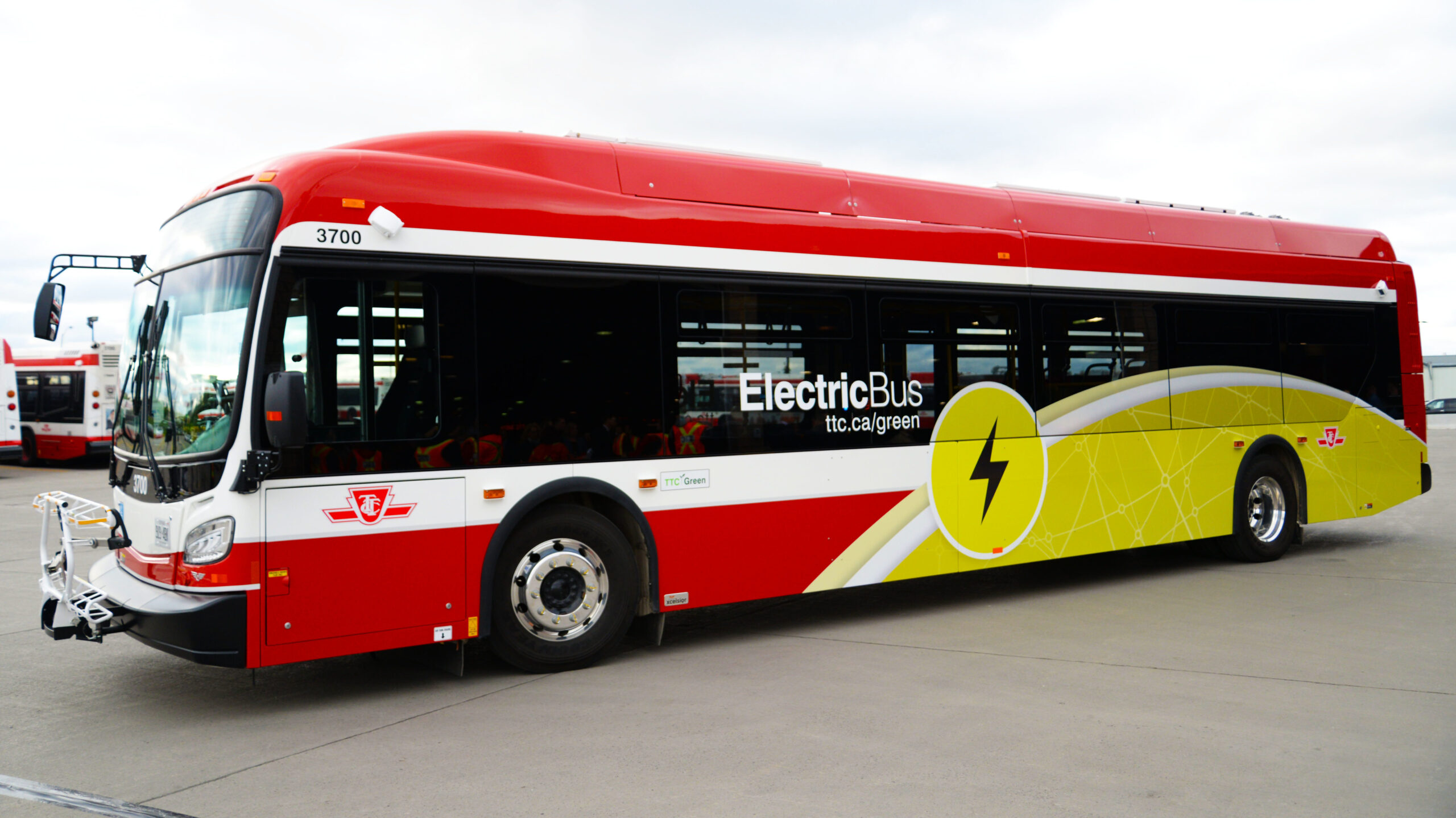 Toronto’s first all-electric bus was unveiled on Monday at TTC’s Arrow Road Bus division and was put in service on the 35 Jane route.