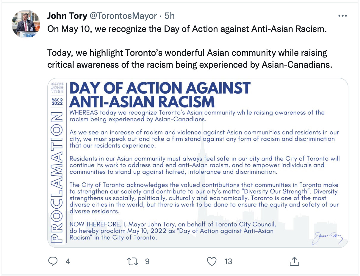 Toronto Mayor John Tory announced May 10 as a Day of Action against Anti-Asian Racism.