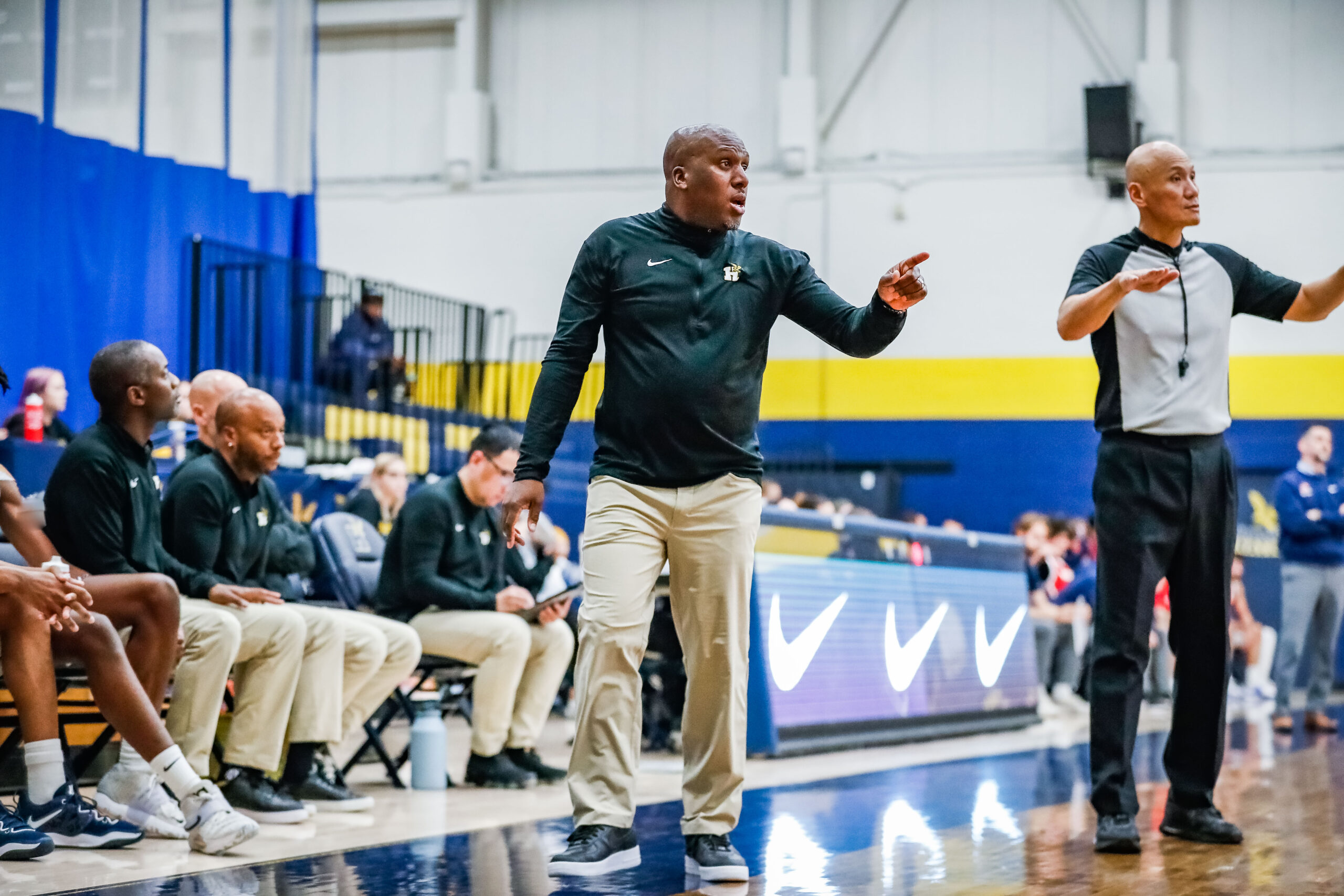 Hawks head coach Omar Mills talking to his players from the sidelines in 97-70 win over Redeemer Royals. Photo credit: Humber Athletics
