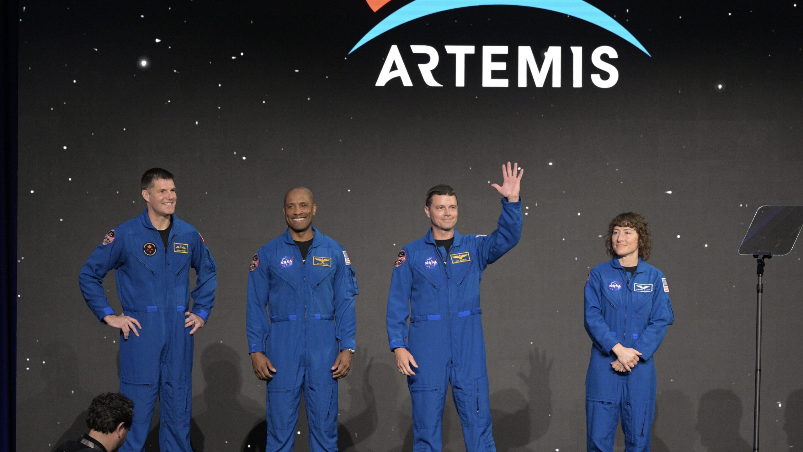American astronauts Christina Koch, Victor Glover, Reid Wiseman, and Canadian astronaut Jeremy Hansen. Photo credit: NASA/Josh Valcarcel