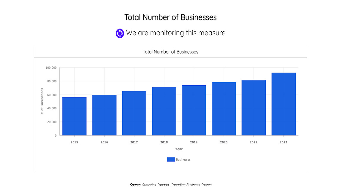 Total Number of Business in a bar graph provided by Geohub Brampton - City of Brampton. With data ranging from 2015 to 2022. Photo credit: Screengrab, GeohubBrampton & City of Brampton